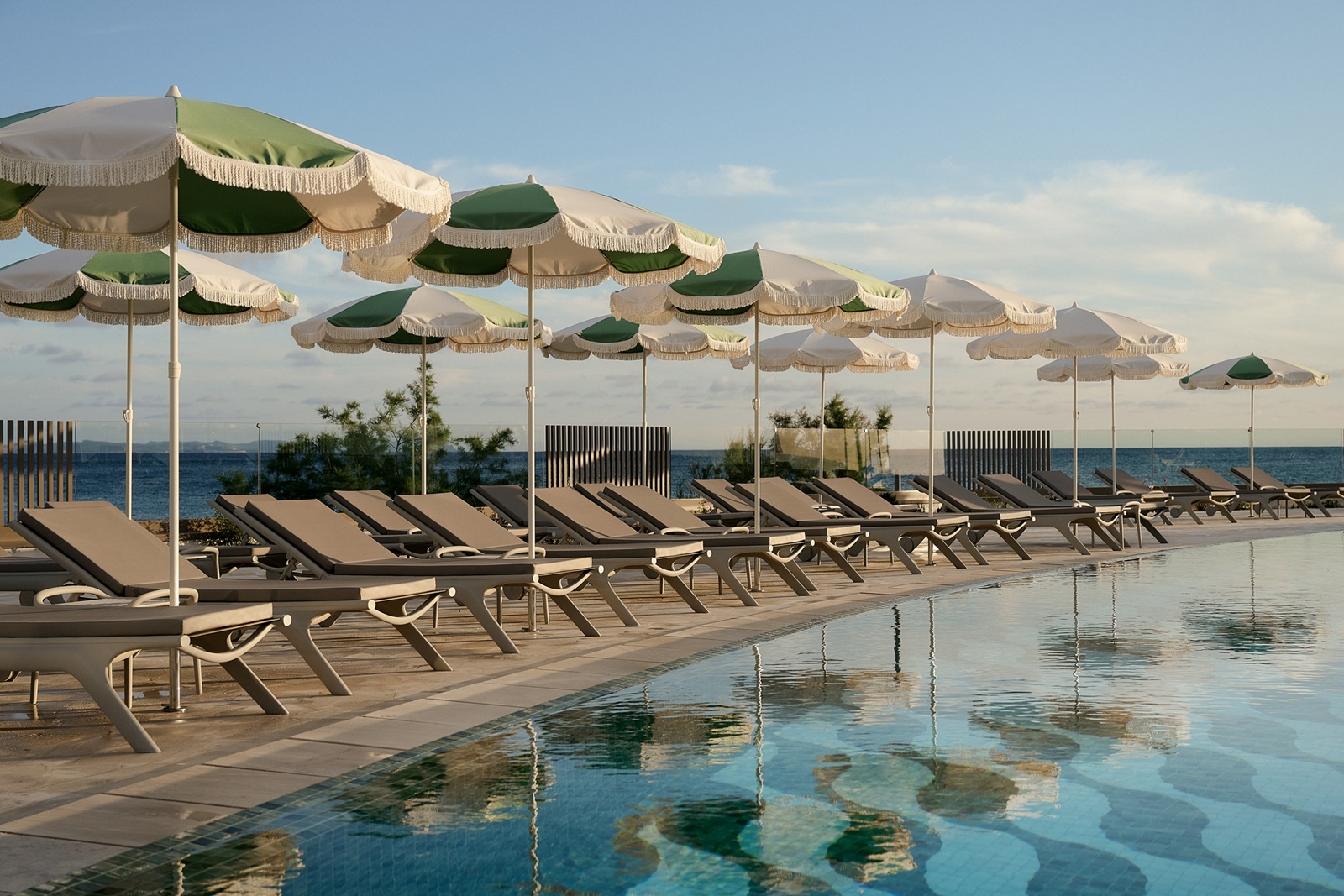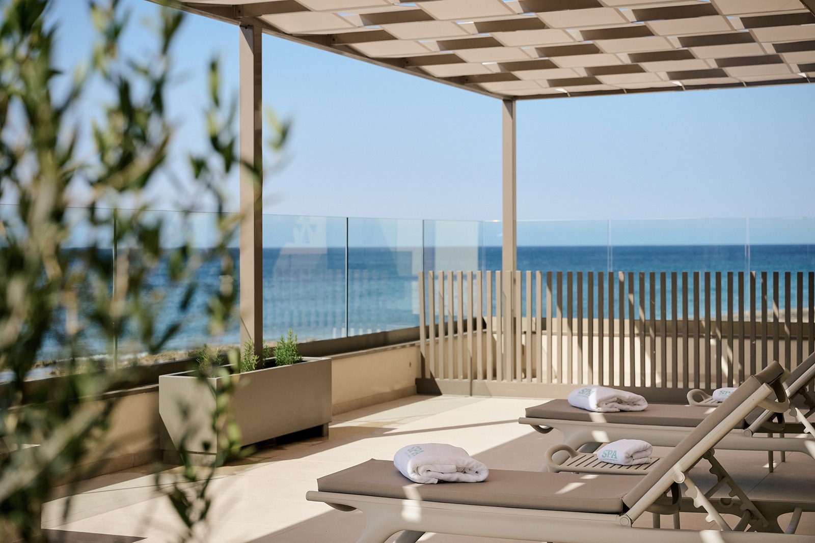 zonneterras met ligbedden, parasols en handdoeken