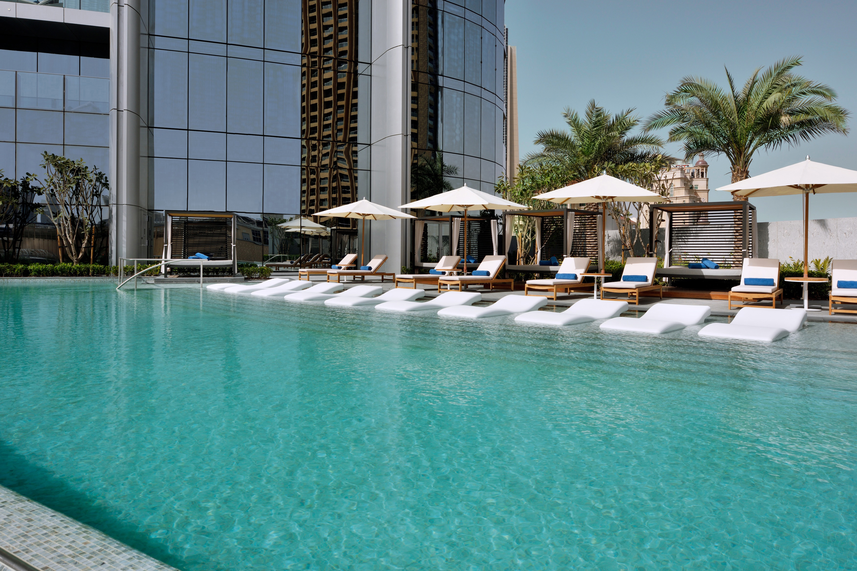 ligbedden, parasols en handdoeken aan het zwembad