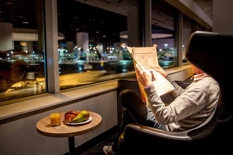 En thuis voelen we ons meteen, in de lederen fauteuils met uitzicht op het tarmac.