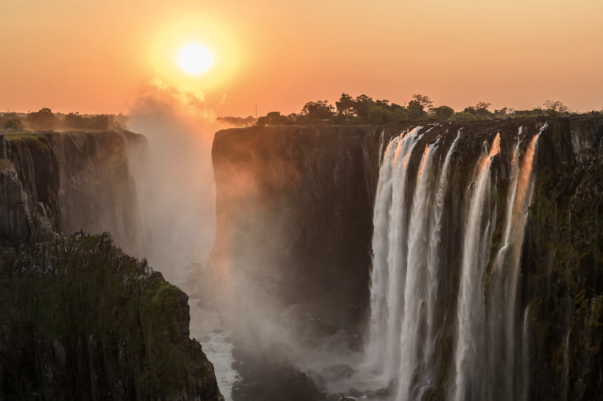 Victoria Falls betekent in de lokale taal: “Mosi-oa-Tunya ofwel “de rook die dondert”. U begrijpt meteen waarom als u ziet hoe deze enorme watervallen zich met volle kracht in de 108 m diepe en heel smalle Batoka-kloof storten. De enorme mistsluier die hierdoor wordt gevormd, is op zonnige dagen mijlenver zichtbaar. In het kleine stadje Victoria Falls worden tal van activiteiten aangeboden om u op een rustige of actieve manier te vermaken. Savoureer uw High Tea in de koloniale sfeer van het historische Victoria Falls Hotel. Waag u aan een zipline avontuur of een bungeesprong of boek een helikopter voor een spectaculaire vlucht over deze ontzagwekkende watervallen.