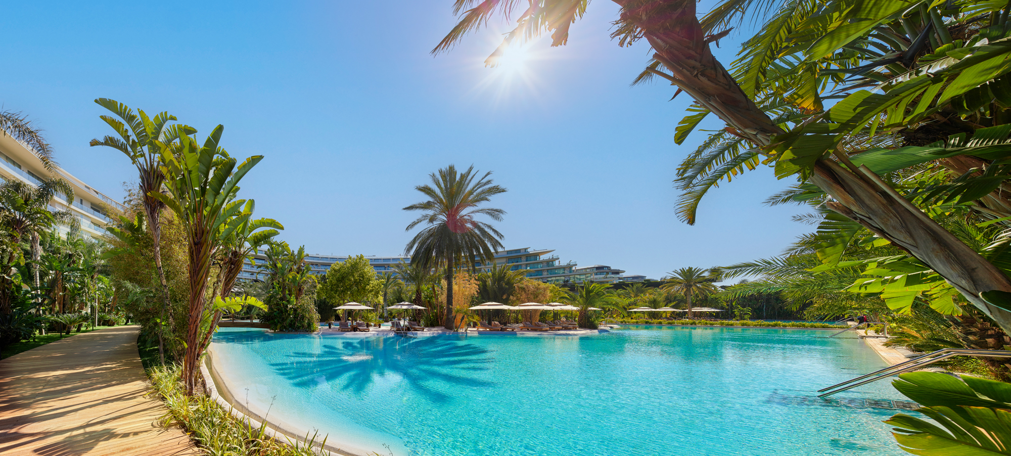 ligbedden, parasols en handdoeken aan het zwembad en aan het strand